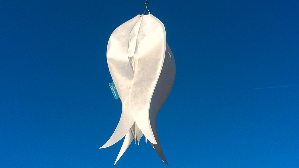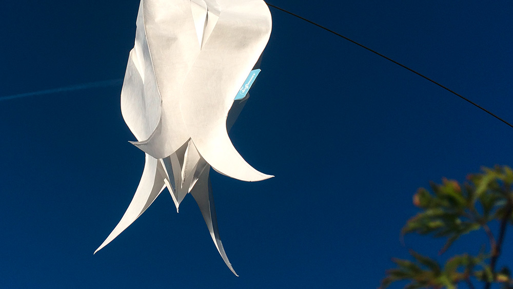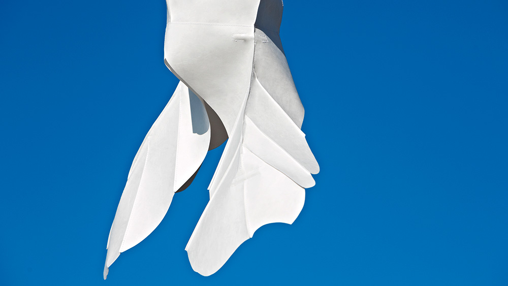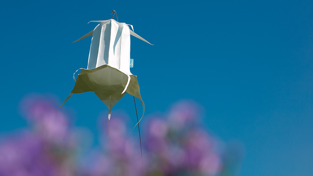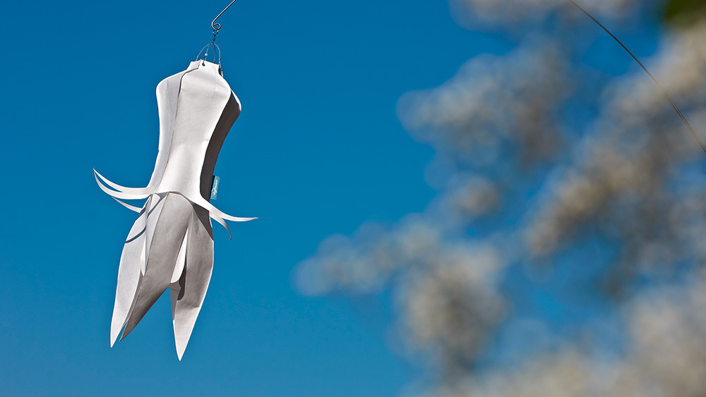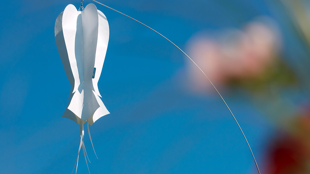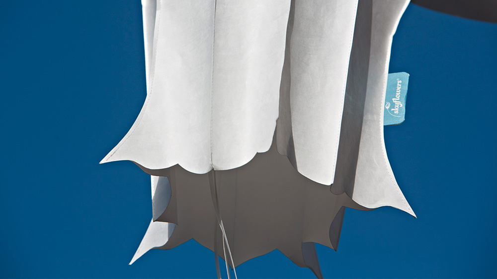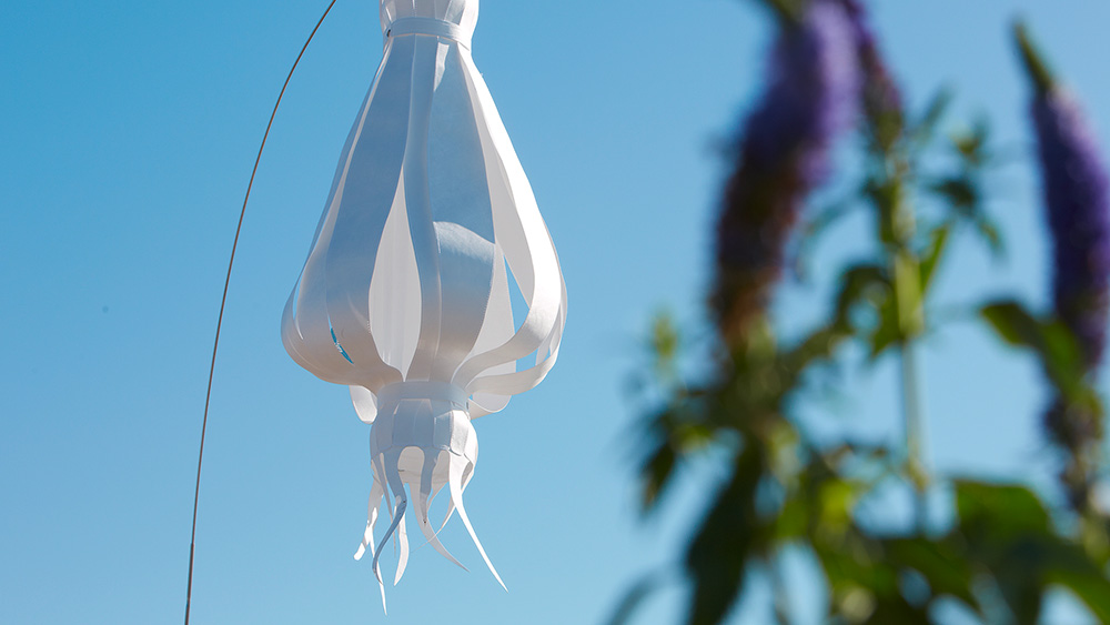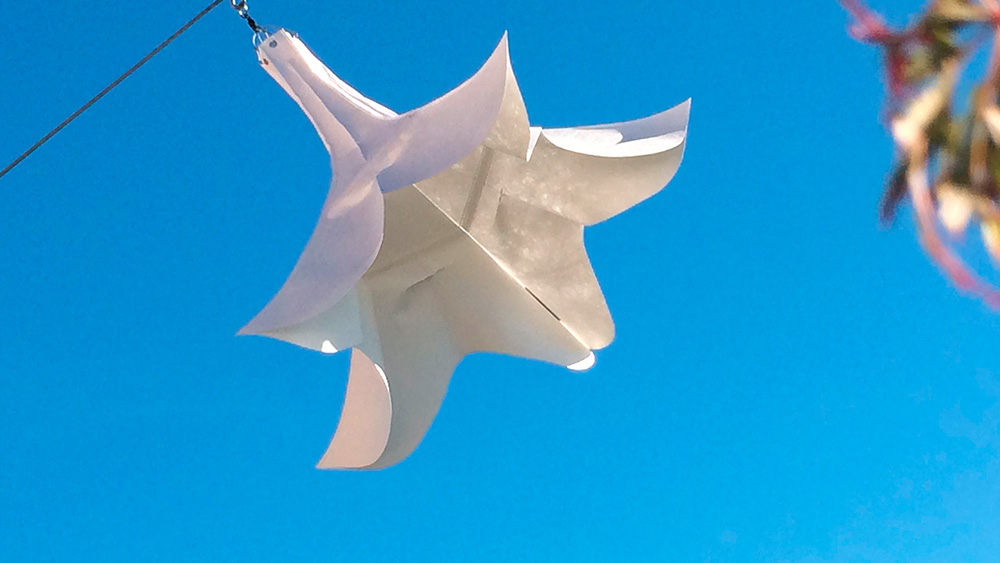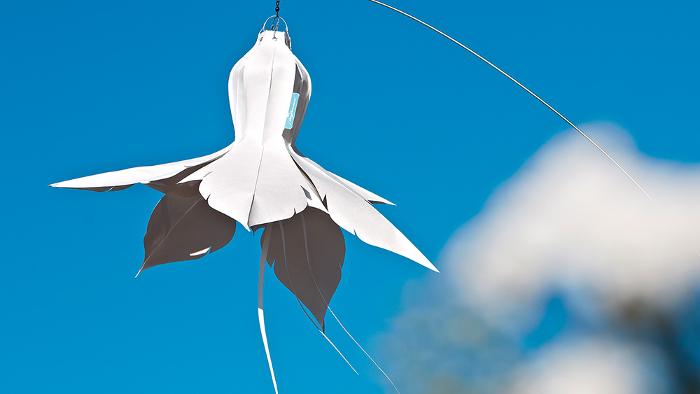 Die skyflowers Zaunwinde ist in zwei Größen erhältlich. Die trichterförmige Blütenkrone besitzt in der Ausführung „small“ eine Höhe von ca. 30 cm und einen Durchmesser von 60 cm. Die große Schwester (medium) bringt etwas mehr Körper mit und hat eine Höhe von ca. 45 cm bei einem Durchmesser von ca. 75 cm. Der Schirm und die ausladende Blütenhülle bieten genügend Angriffsfläche für rege, drehende Bewegungen im Wind. Beide Größen des skyflowers Windspiels bestehen aus insgesamt fünf Schnittteilen. In der oberen Draufsicht sind eingearbeitete Glasfaserstäbe zu erkennen, die dem großen Schirm ausreichend Stabilität verleihen. Während die kleinere Ausführung noch relativ neu im Sortiment ist, begeistern sich immer mehr Kunden für die große Ausführung der skyflowers Zaunwinde.
