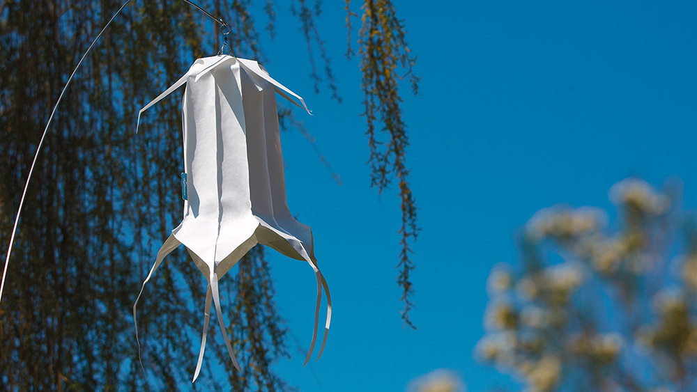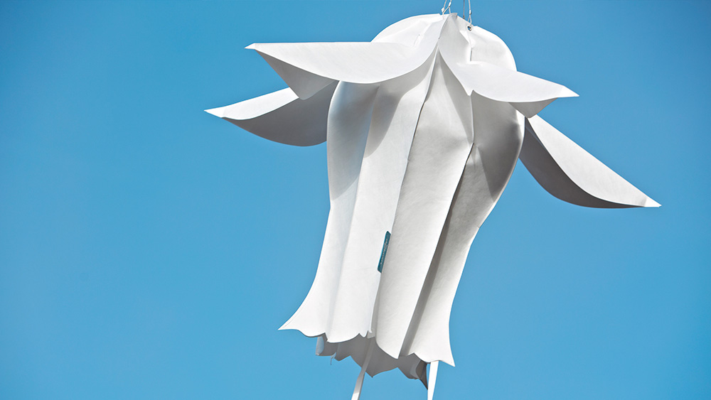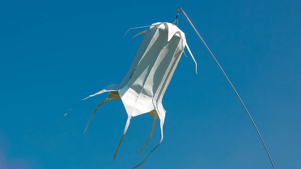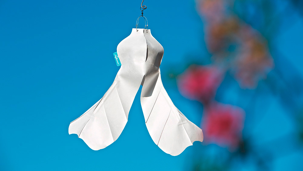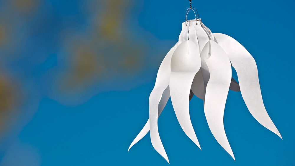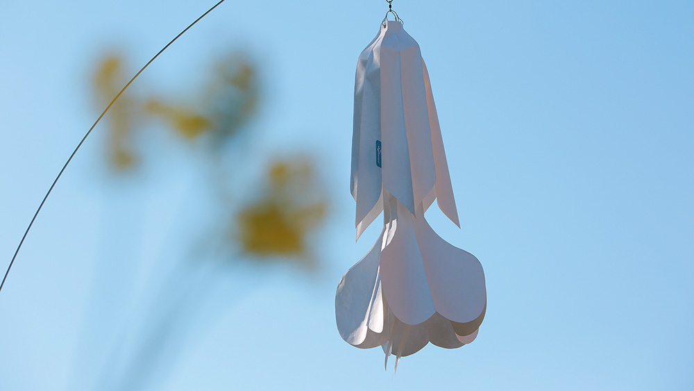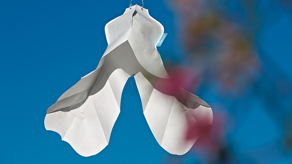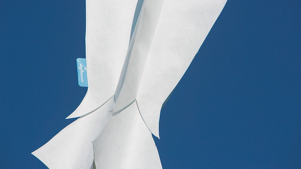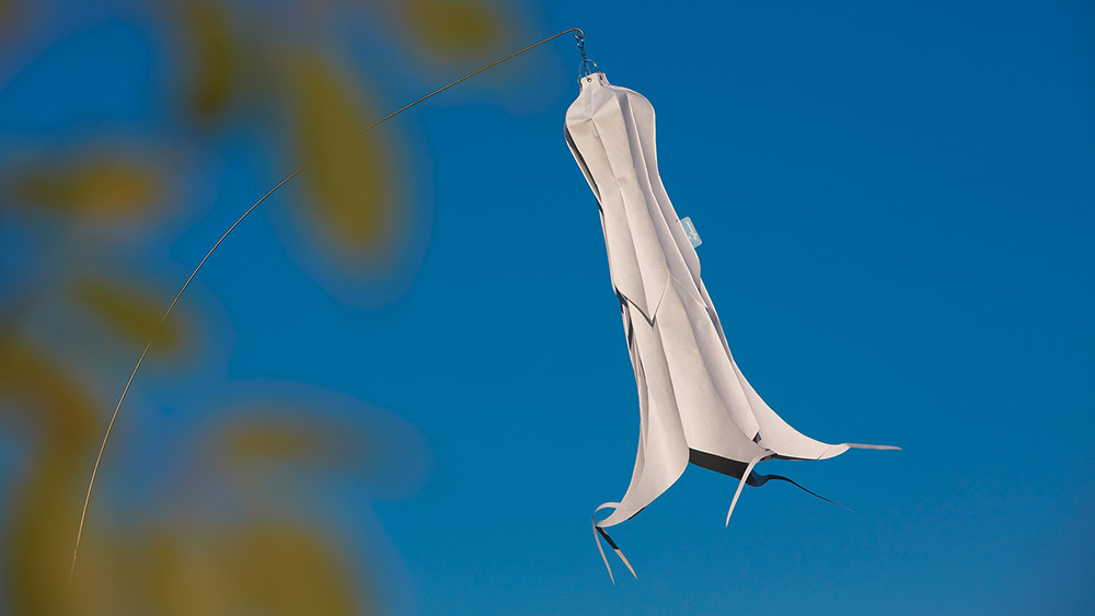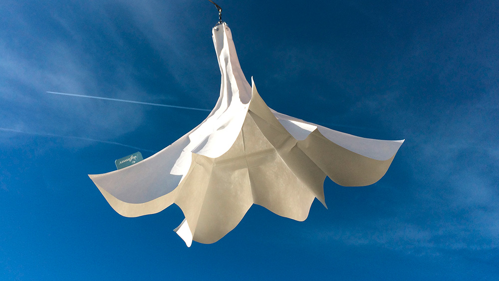 Die skyflowers Zaunwinde ist in zwei Größen erhältlich. Die trichterförmige Blütenkrone besitzt in der Ausführung „small“ eine Höhe von ca. 30 cm und einen Durchmesser von 60 cm. Die große Schwester (medium) bringt etwas mehr Körper mit und hat eine Höhe von ca. 45 cm bei einem Durchmesser von ca. 75 cm. Der Schirm und die ausladende Blütenhülle bieten genügend Angriffsfläche für rege, drehende Bewegungen im Wind. Beide Größen des skyflowers Windspiels bestehen aus insgesamt fünf Schnittteilen. In der oberen Draufsicht sind eingearbeitete Glasfaserstäbe zu erkennen, die dem großen Schirm ausreichend Stabilität verleihen. Während die kleinere Ausführung noch relativ neu im Sortiment ist, begeistern sich immer mehr Kunden für die große Ausführung der skyflowers Zaunwinde.