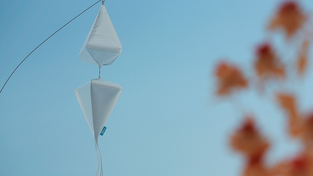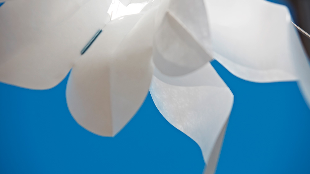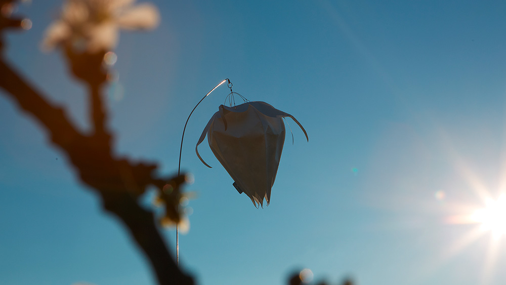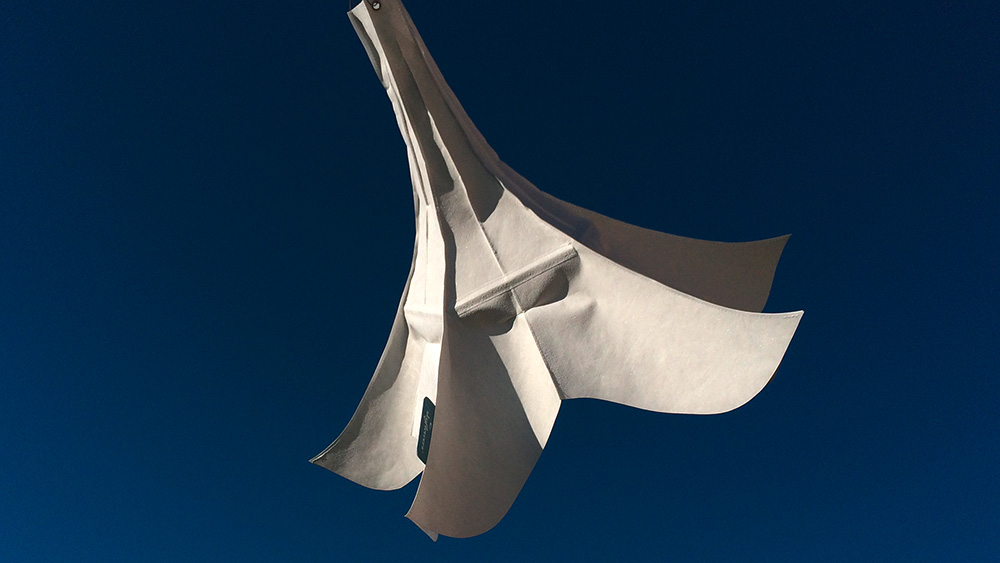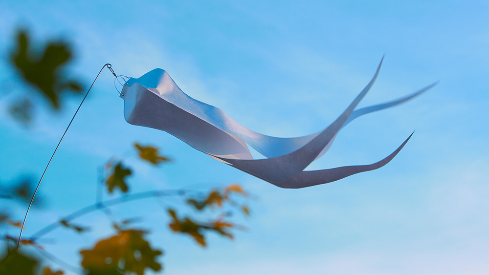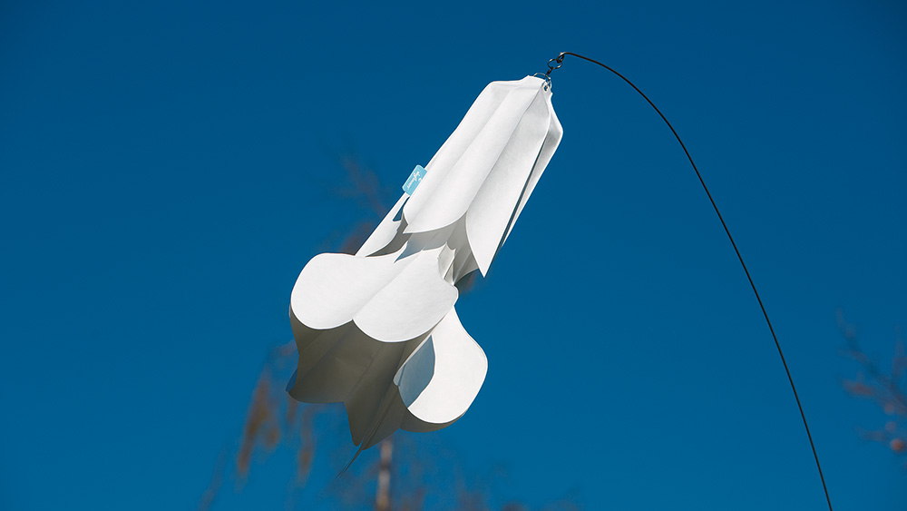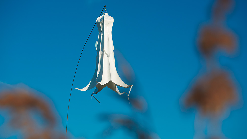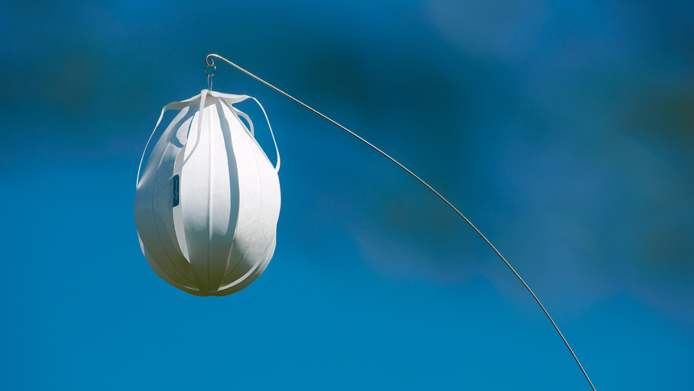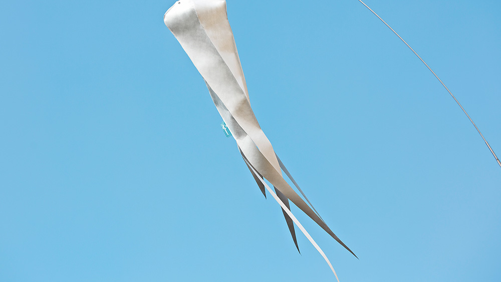 Die skyflowers Zaunwinde ist in zwei Größen erhältlich. Die trichterförmige Blütenkrone besitzt in der Ausführung „small“ eine Höhe von ca. 30 cm und einen Durchmesser von 60 cm. Die große Schwester (medium) bringt etwas mehr Körper mit und hat eine Höhe von ca. 45 cm bei einem Durchmesser von ca. 75 cm. Der Schirm und die ausladende Blütenhülle bieten genügend Angriffsfläche für rege, drehende Bewegungen im Wind. Beide Größen des skyflowers Windspiels bestehen aus insgesamt fünf Schnittteilen. In der oberen Draufsicht sind eingearbeitete Glasfaserstäbe zu erkennen, die dem großen Schirm ausreichend Stabilität verleihen. Während die kleinere Ausführung noch relativ neu im Sortiment ist, begeistern sich immer mehr Kunden für die große Ausführung der skyflowers Zaunwinde.