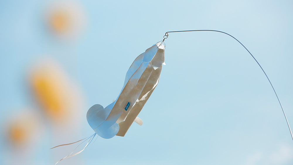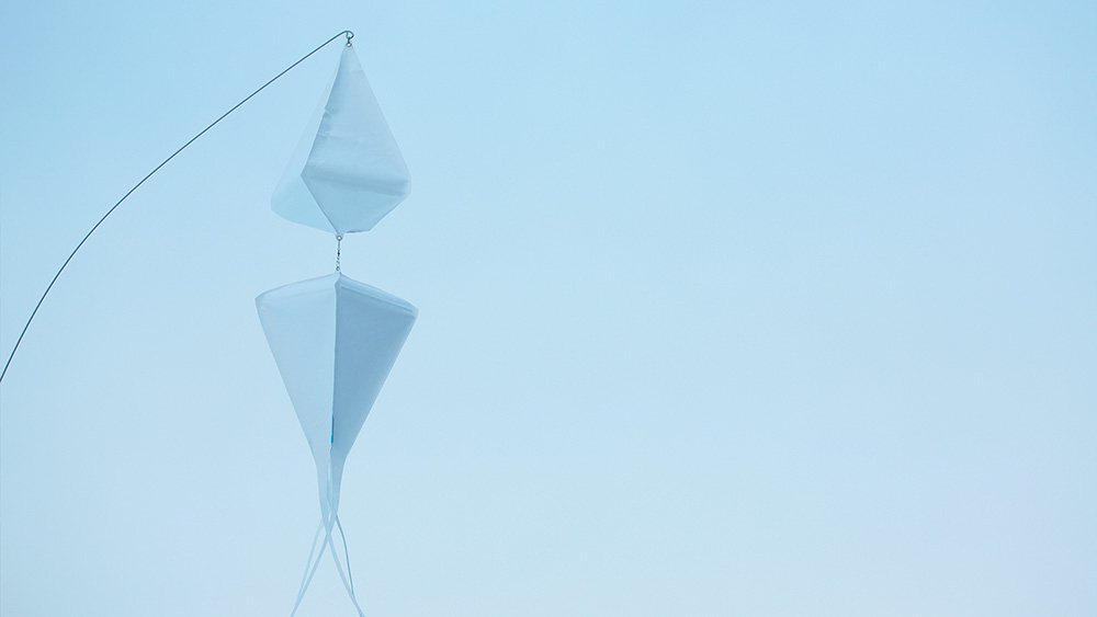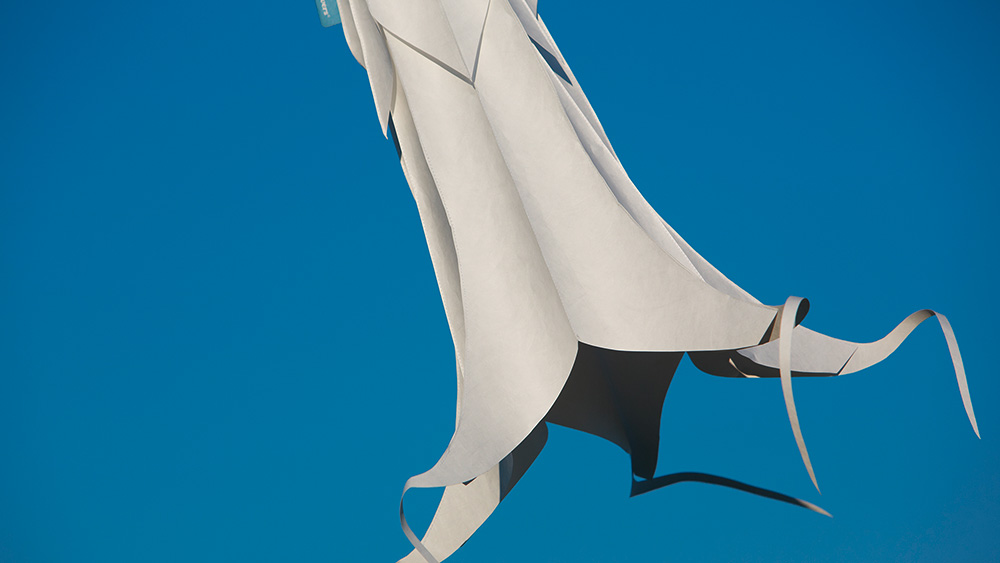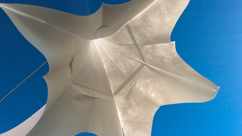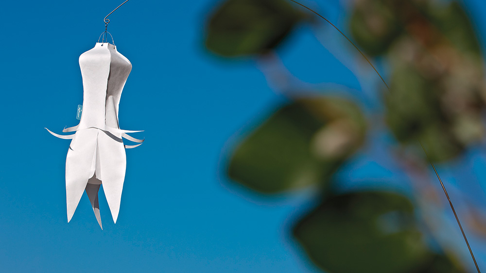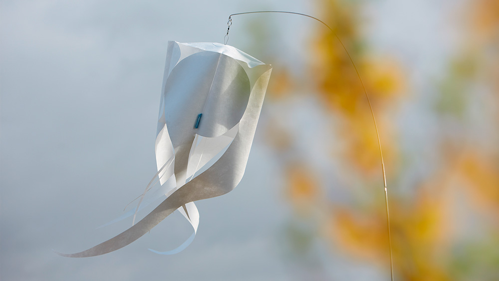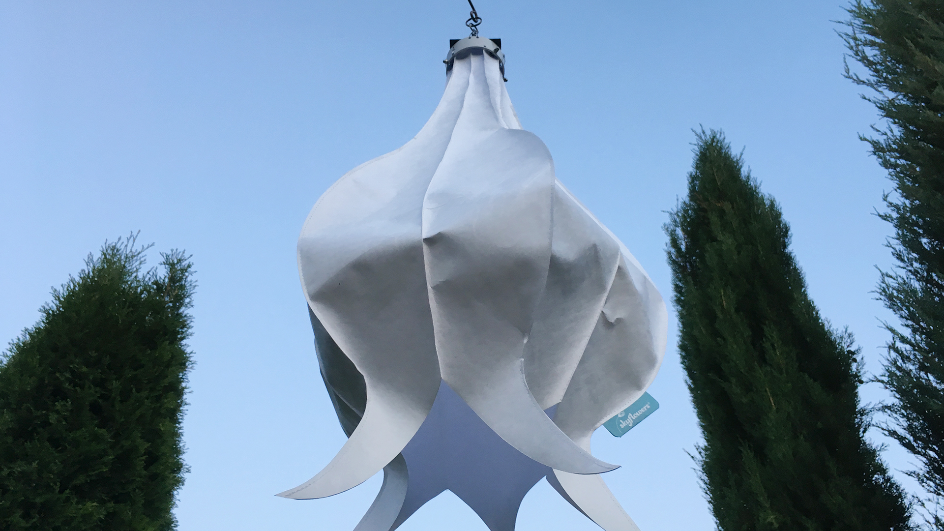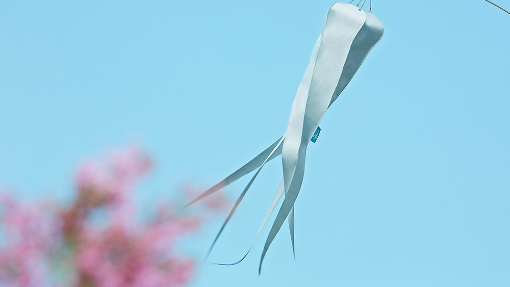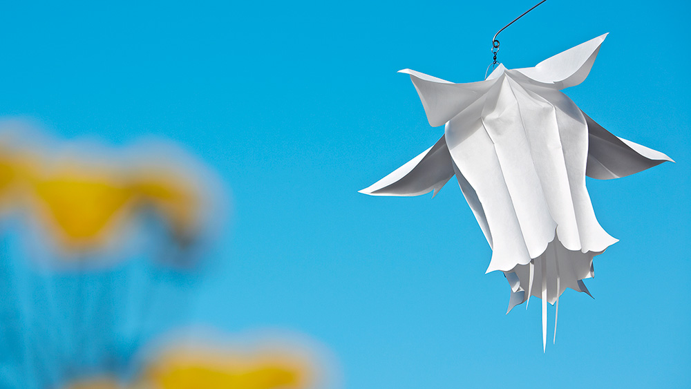 Die skyflowers Zaunwinde ist in zwei Größen erhältlich. Die trichterförmige Blütenkrone besitzt in der Ausführung „small“ eine Höhe von ca. 30 cm und einen Durchmesser von 60 cm. Die große Schwester (medium) bringt etwas mehr Körper mit und hat eine Höhe von ca. 45 cm bei einem Durchmesser von ca. 75 cm. Der Schirm und die ausladende Blütenhülle bieten genügend Angriffsfläche für rege, drehende Bewegungen im Wind. Beide Größen des skyflowers Windspiels bestehen aus insgesamt fünf Schnittteilen. In der oberen Draufsicht sind eingearbeitete Glasfaserstäbe zu erkennen, die dem großen Schirm ausreichend Stabilität verleihen. Während die kleinere Ausführung noch relativ neu im Sortiment ist, begeistern sich immer mehr Kunden für die große Ausführung der skyflowers Zaunwinde.