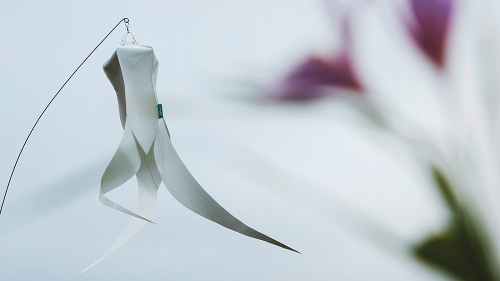Die skyflowers Schönmalve ist in zwei Größen erhältlich. Die kleinere Ausführung (small) misst eine Länge von ca. 38 cm, der Durchmesser beträgt ca. 20 cm. Die große Schwester (medium) bringt etwas mehr Körper mit und hat eine Länge von ca. 75 cm bei einem Durchmesser von ca. 30 cm. Die Schönmalve zeigt im Wind ihre natürliche Form und beschränkt sich auf wippende und drehende Bewegungen. Dieses Windspiel besteht aus insgesamt zehn Schnittteilen.
