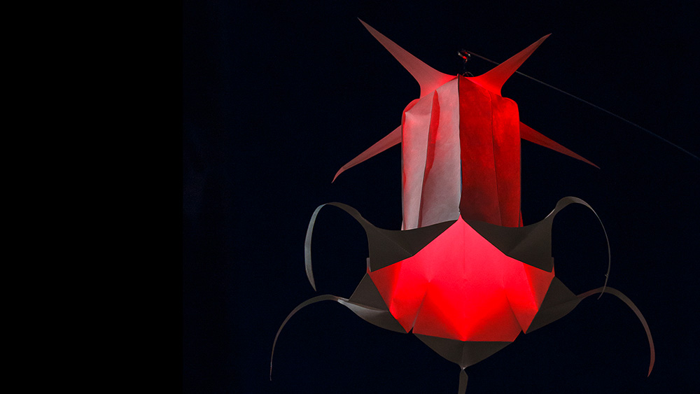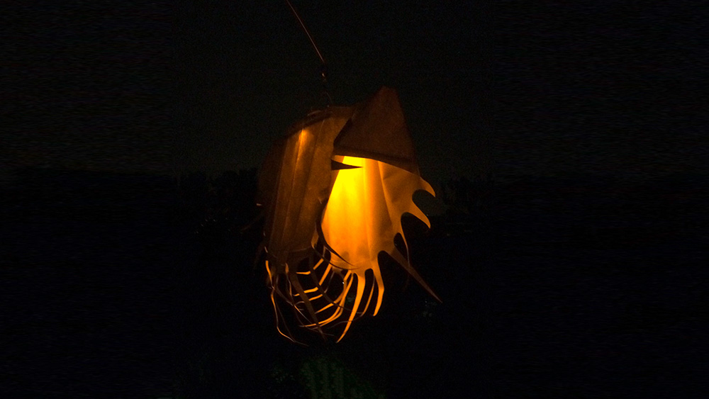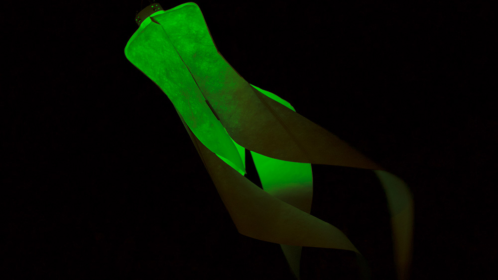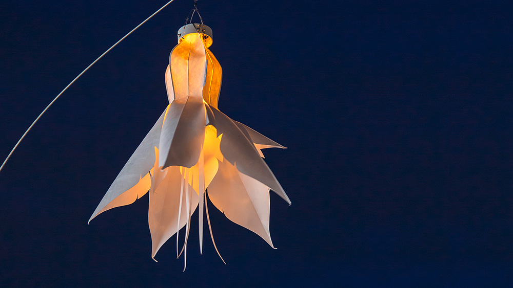 Der Blütenkelch dieses Windspiels fängt das optionale LED-Licht trichterförmig ein und lässt das Licht gleichmäßig diffundieren. Der Beleuchtungsring wird auf die Kelchzähne aufgesetzt. Eine optionale Beschriftung in Längsrichtung der Trichterform lässt sich gut realisieren, wobei die Kelchlänge nur kurze Begriffe zulässt. Für ein optionales Logo bieten die kleinen Kronblätter nur eingeschränkte Möglichkeiten; zu beachten ist dabei auch die zusätzliche Naht in der Mitte des Blattes, die den Aufdruck unterbricht.