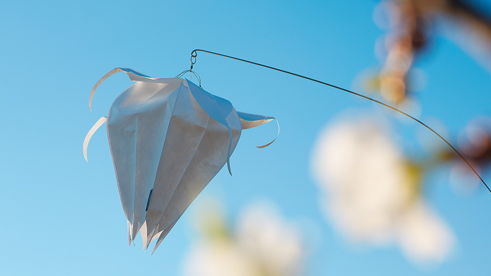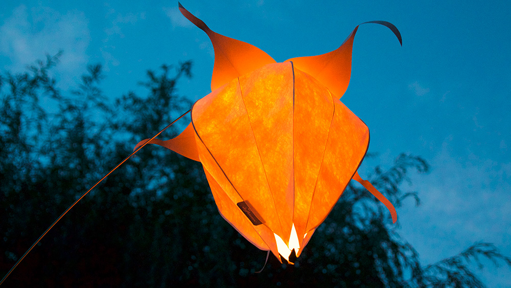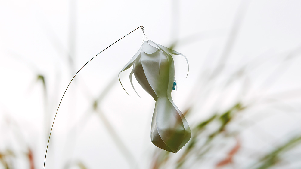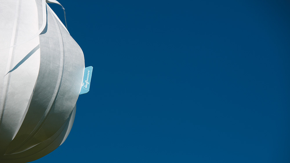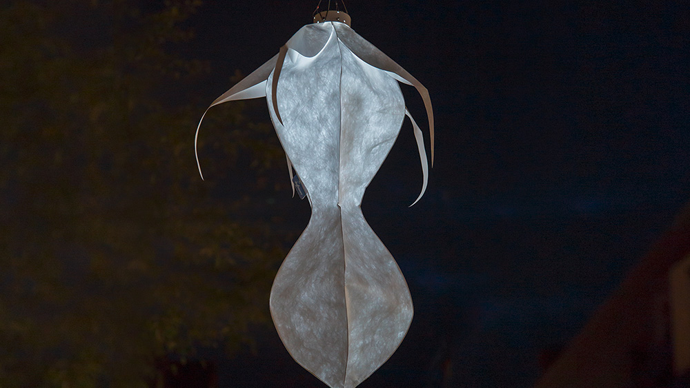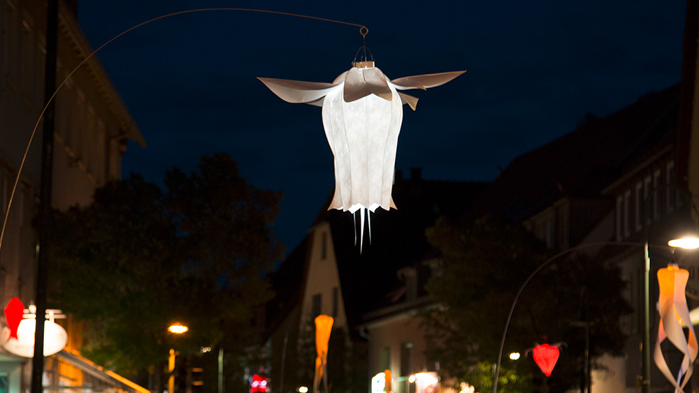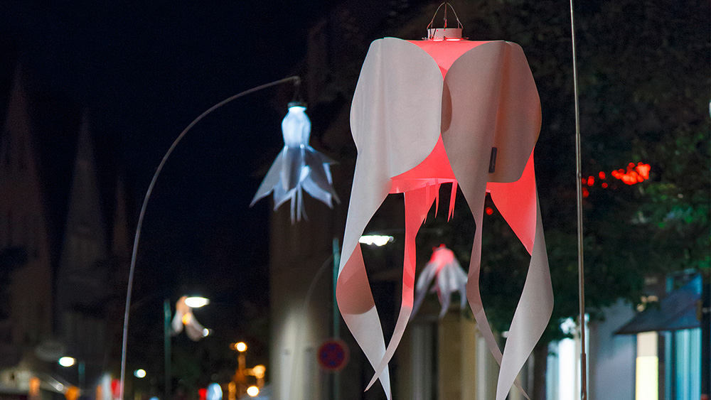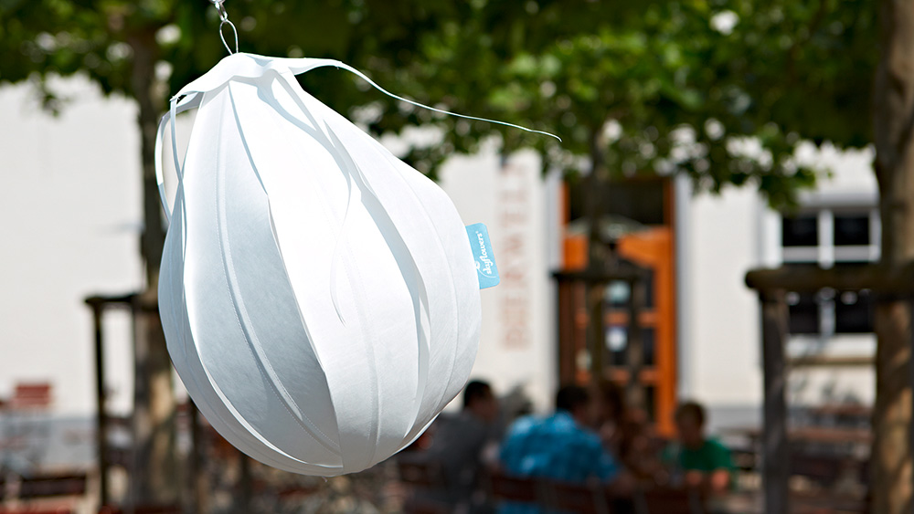 Die skyflowers Zaunwinde lässt sich leider nicht mit der optionalen LED-Beleuchtung ergänzen. Der schmale Trichter fängt das Licht zwar konzentriert von oben ein, der untere, ausladende Schirm hingegen streut das Licht ins Nichts. Auch optisch würde ein oben aufgesetzter Beleuchtungsring eher befremdlich wirken. Grundsätzlich möglich ist eine Beschriftung oder das Aufdrucken eines Logos.