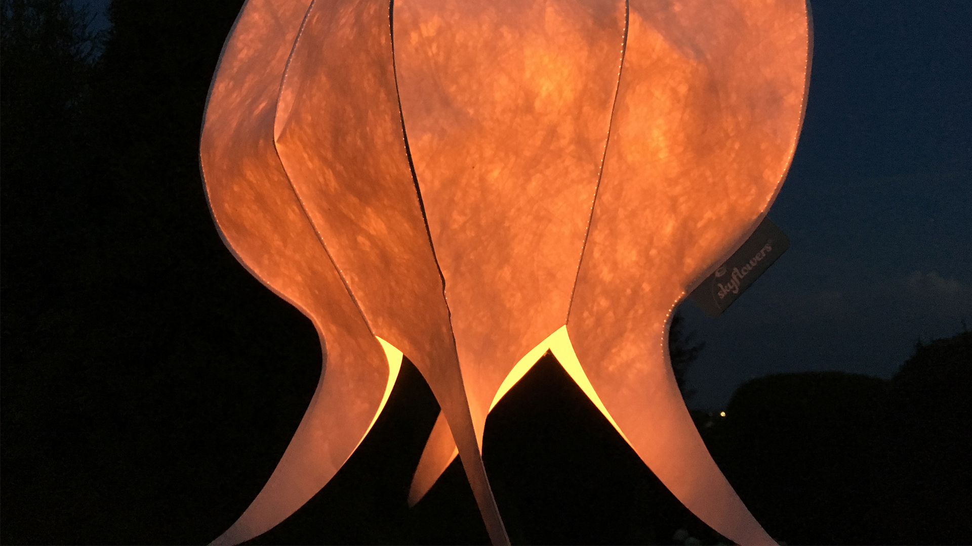 Die größere skyflowers Schönmalve (medium) lässt sich gut mit der optionalen LED-Beleuchtung ergänzen. Der Beleuchtungsring wird von oben in die Kelchöffnung eingesetzt und bleibt unsichtbar. Das Leuchtbild variiert: Im oberen Bereich wird das Licht durch die Zweilagigkeit (Kelch und Kronblätter) etwas reduziert, im unteren Bereich ist die Leuchtkraft etwas ausgeprägter, da hier nur die Kronblätter das Licht auffangen. Die kleinere Schönmalve (small) lässt sich wegen der zu engen Kelchöffnung nicht beleuchten. Der optionale Aufdruck eines Logos oder eines Schriftzugs lässt sich in beiden Größen auf dem Kelch realisieren.