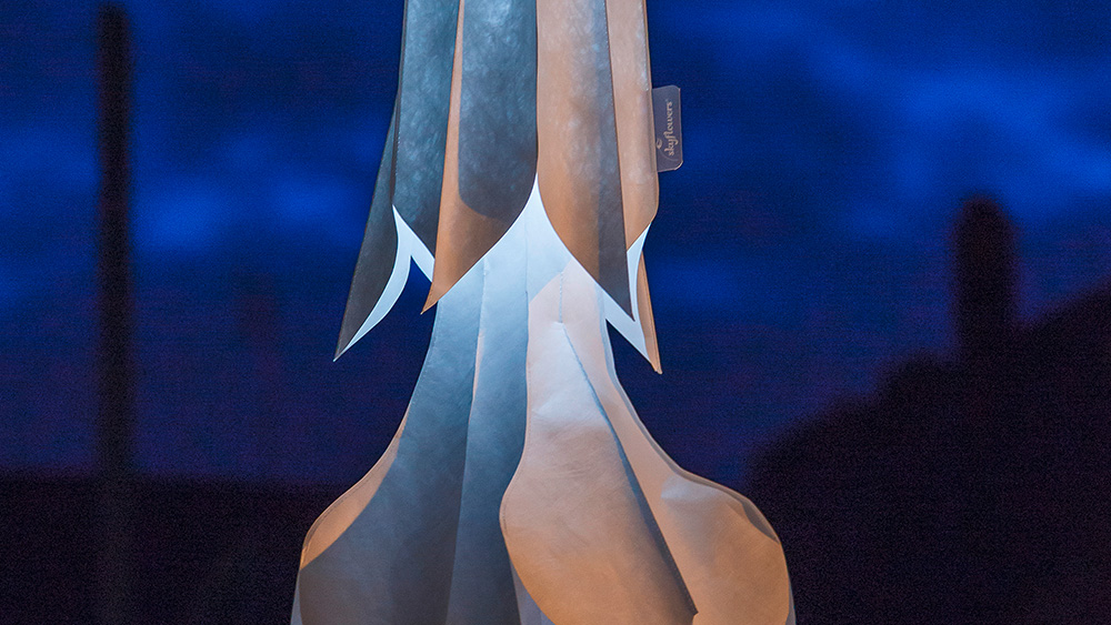 Dieses skyflowers Windspiel lässt sich sehr gut mit der optionalen LED-Beleuchtung ergänzen. Der Blattkörper kapselt das Licht ohne große Streuverluste wirkungsvoll ab. Eine Beschriftung oder das Aufdrucken eines Logos bieten sich bei diesem Modell geradezu an. Die mehrfach vorhandenen Abnäher unterbrechen das Bild oder die Schrift für den Betrachter dabei nur geringfügig.