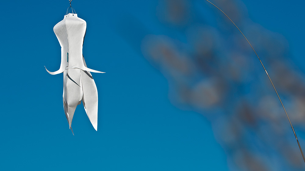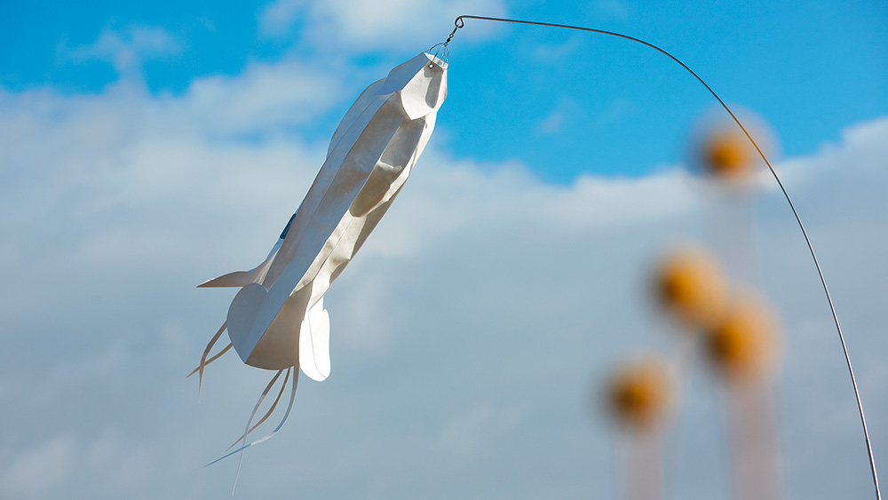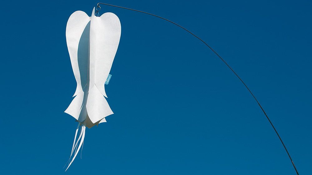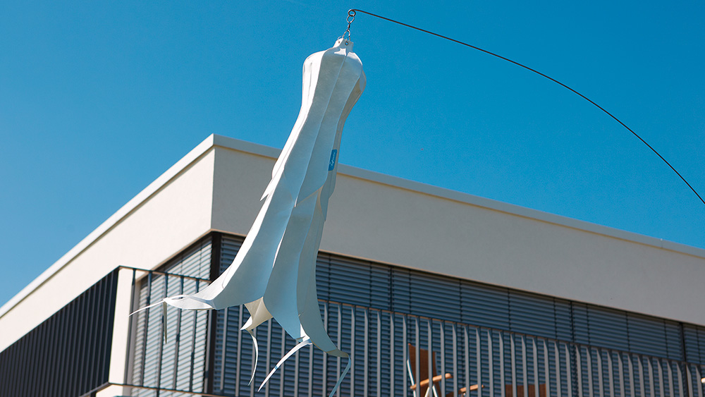 Dieses skyflowers Windspiel lässt sich gut mit der optionalen LED-Beleuchtung ergänzen. Das Leuchtbild erzeugt im oberen Bereich eine interessante Tiefenwirkung und nach unten hin eine wechselnde Reflexion des beweglichen Schotenendes. Beschriftung oder Logoaufdruck sind grundsätzlich möglich, die Flächen bieten allerdings nur eingeschränkte Möglichkeiten dafür.