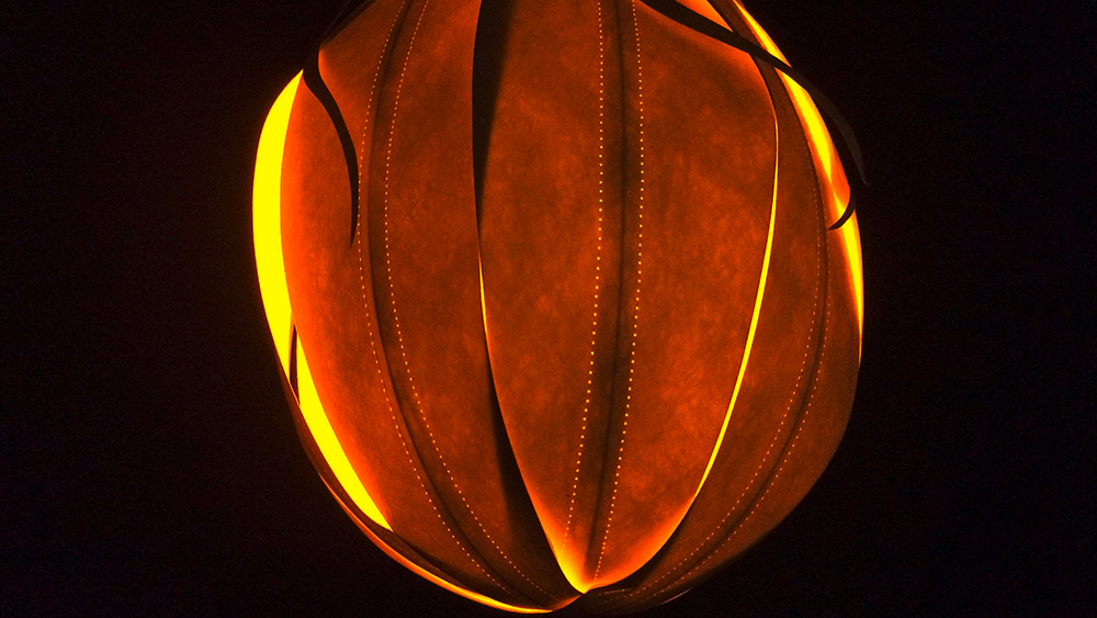 Die skyflowers Erdnuss lässt sich ganz leicht mit der optionalen LED-Beleuchtung ergänzen. Der Beleuchtungsring wird oben sichtbar auf die Kelchöffnung aufgesetzt. Die obere Fruchtkammer wird dabei stärker ausgeleuchtet als die untere Kammer, die etwas weniger Licht von oben erhält. Da die Hülsenfrucht nur aus einer Lage besteht und eine kugelige und geschlossene Form aufweist, ist die Lichtausbeute recht ordentlich. Der optionale Aufdruck eines Logos oder eines Schriftzugs lässt sich vor allem auf der oberen Hülsenkammer gut realisieren.