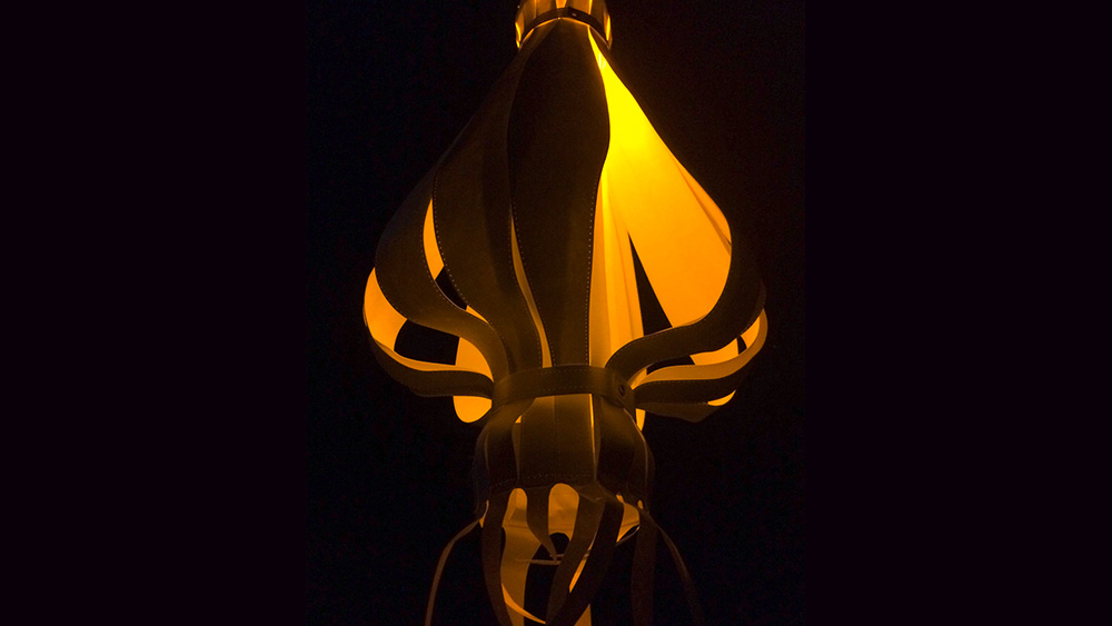 Der Blütenkörper des Stechapfels bündelt das optionale LED-Licht entlang der Trichterform. Der Beleuchtungsring wird auf den kleinen Blütenkelch am oberen Ende aufgesetzt. Im beleuchteten Zustand entwickelt der Stechapfel eine leichte Tiefenwirkung, da durch die zwei Materialschichten im Bereich der Kelchblätter weniger Licht dringen kann als im Bereich der Blütenkrone mit nur einer Materialschicht. Eine optionale Beschriftung in Längsrichtung der Trichterform lässt sich gut realisieren. Für ein optionales Logo bietet die Form nur eingeschränkte Möglichkeiten.